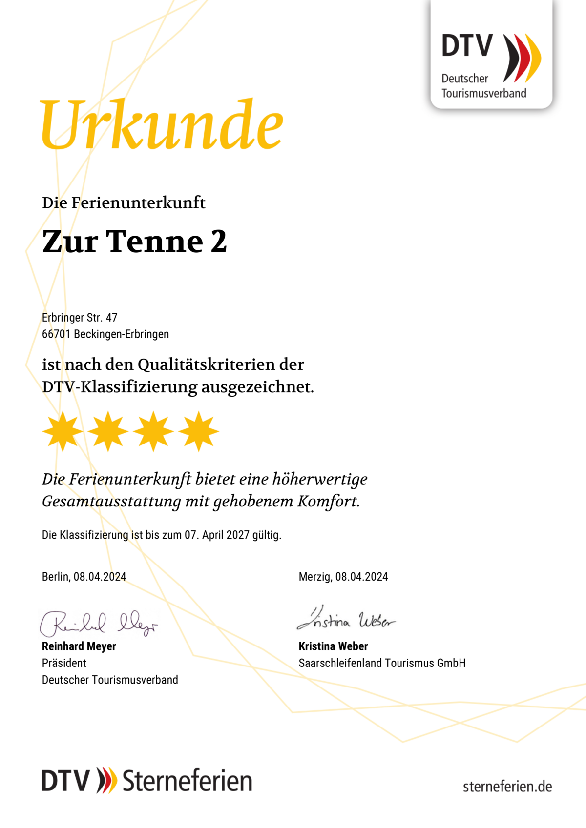 Qualität liegt uns besonders am Herzen: Unsere Ferienwohnungen sind nach ServiceQualität Deutschland zertifiziert und mit 4 Sternen nach DTV klassifiziert.